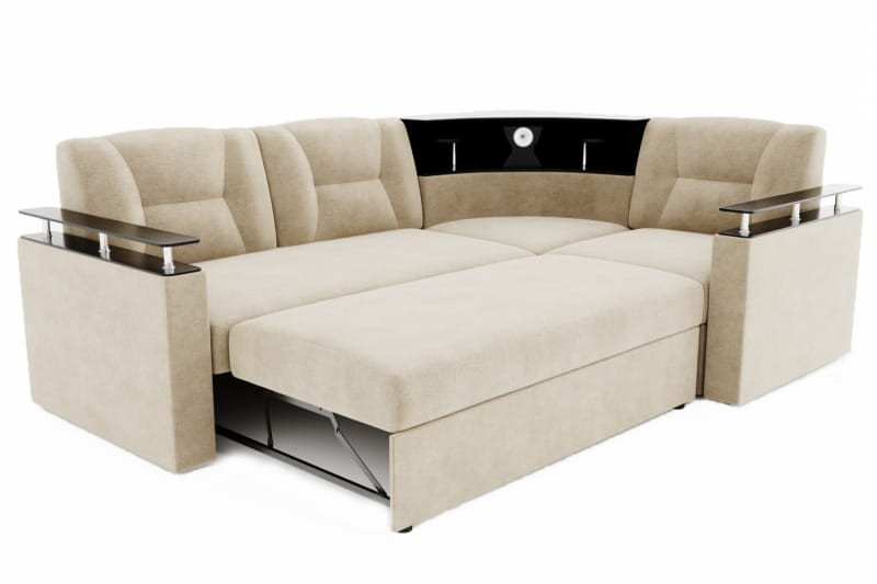 Особенности дивана: Изысканный и стильный трансформер для оригинальных дизайнерских решений! Практичный и вместительный. Барная полка, встроенная в диван. Поможет выгодно зонировать пространство за счёт угловой модели. Имеет встроенную подсветку. Ширина подлокотника - 12 см, длина - 83 см. Высота полки, где находится подсветка: 40 см. Провода для подсветки приобретаются отдельно. Угол дивана универсальный.